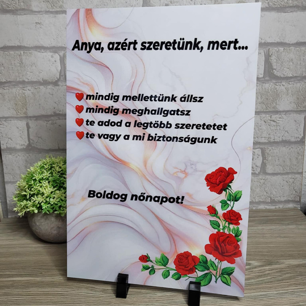 Nőnapi feliratos fémlap – „Anya, azért szeretünk, mert…” rózsás mintával