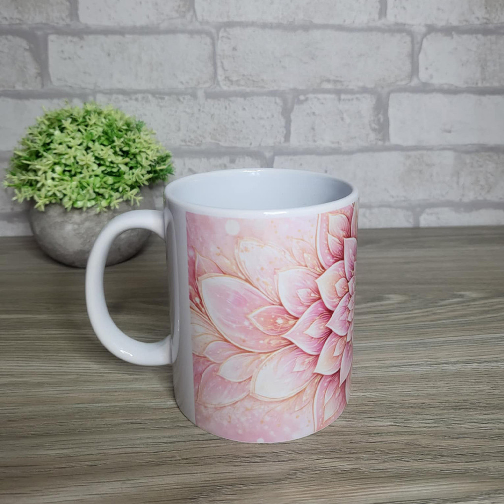 Ez a rózsaszín virágmandala mintával díszített bögre letisztult, mégis különleges darab. A középpontból kibontakozó, réteges virágszirom-minta nyugodt, harmonikus hangulatot teremt, amely tökéletesen illik egy csendes reggeli kávézáshoz vagy esti teázáshoz.