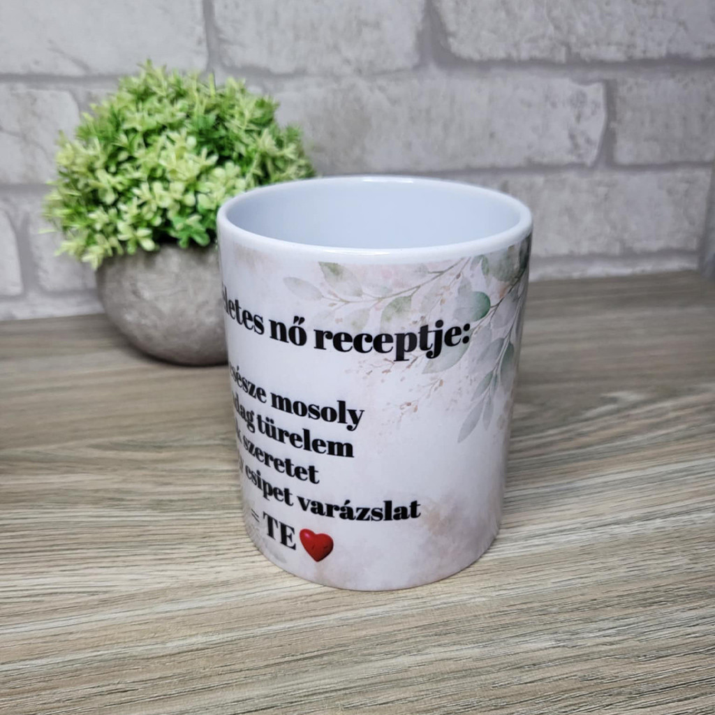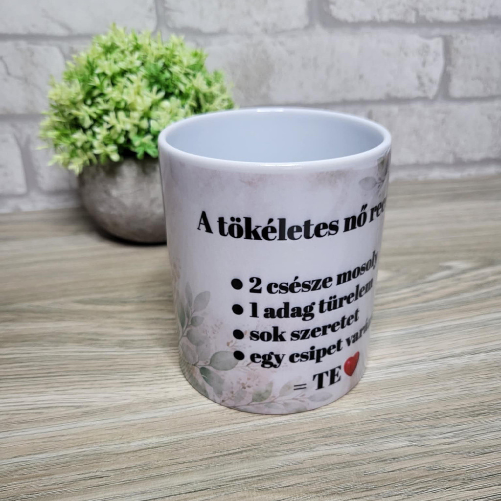 Kedves feliratú porcelán bögre „A tökéletes nő receptje” mintával, nőnapra és különleges alkalmakra. Kész termék, azonnal vihető.